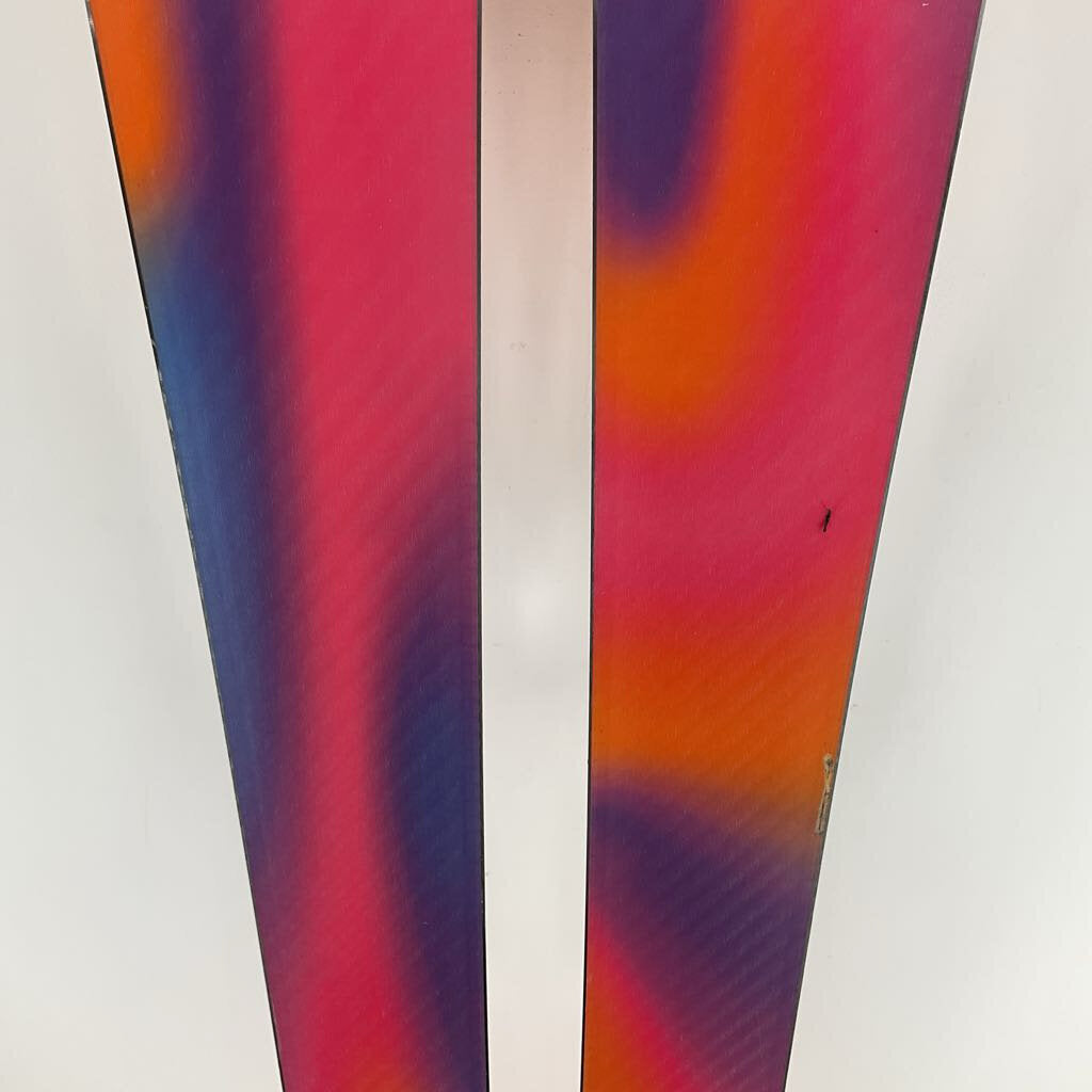 Well Loved - A well loved topsheet shows significant signs of wear and tear including chipping, scratching, and scuffing on a majority of the ski’s surface area.