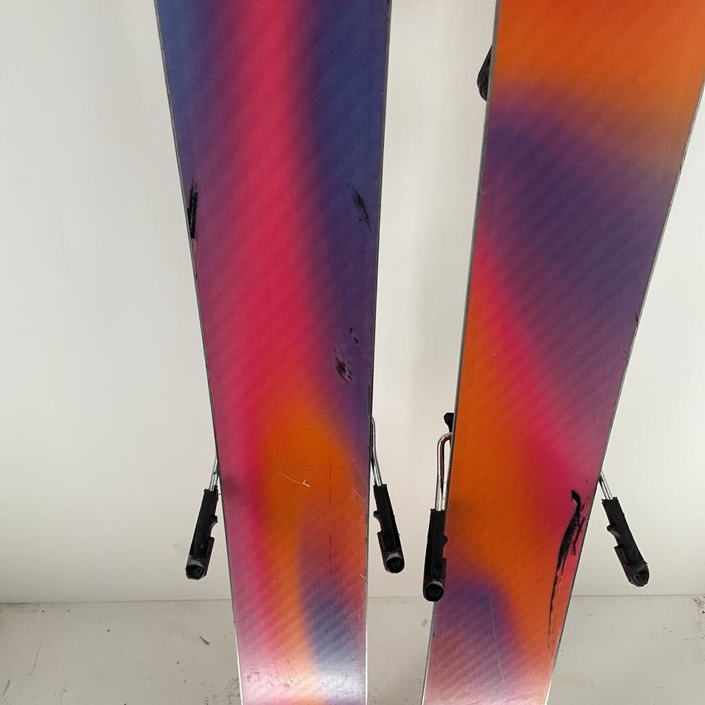 Well Loved - A well loved topsheet shows significant signs of wear and tear including chipping, scratching, and scuffing on a majority of the ski’s surface area.