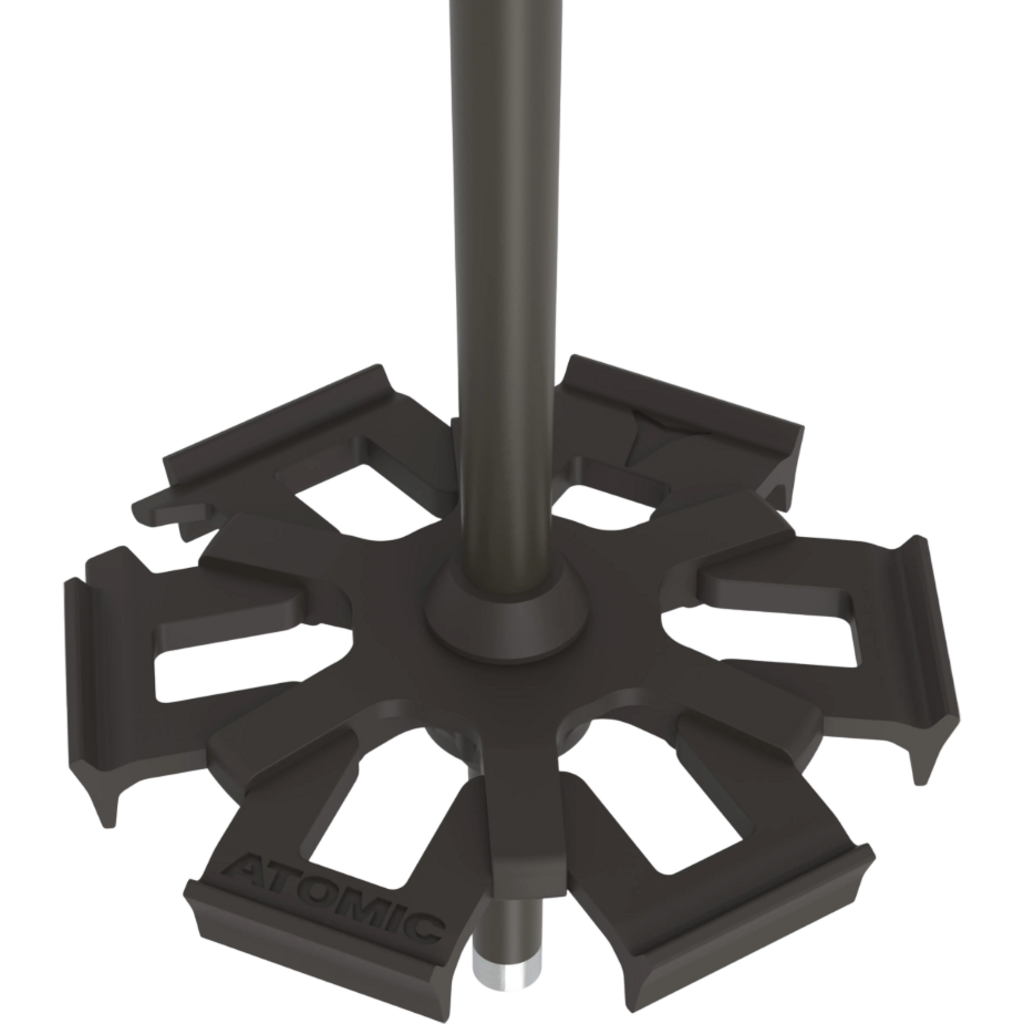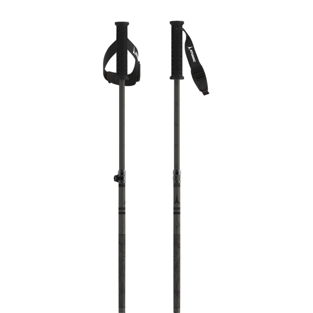 The Atomic Backland FR was built in cooperation with Chris Bentchetler for his big day tour journeys. It features a comfy long grip, big powder baskets and a pozi driver inside if you need some backcountry binding maintenance.
