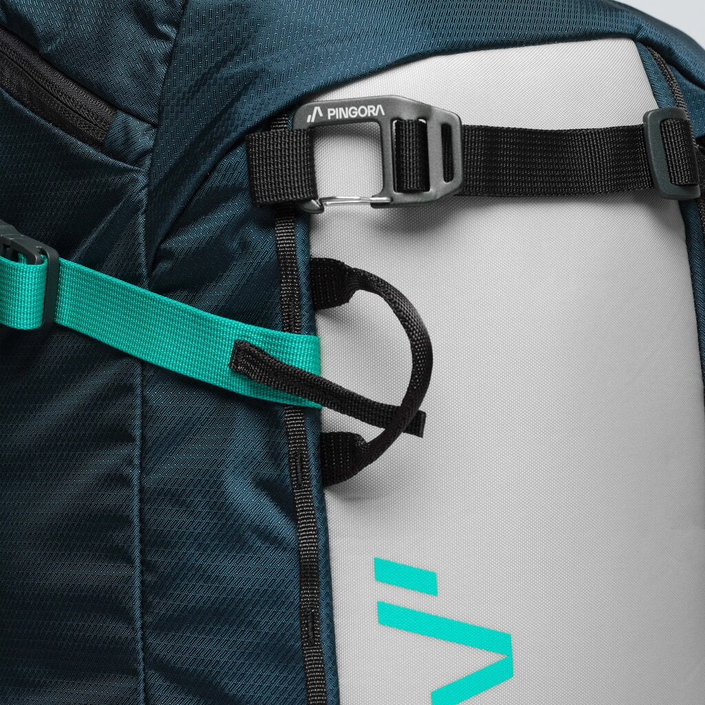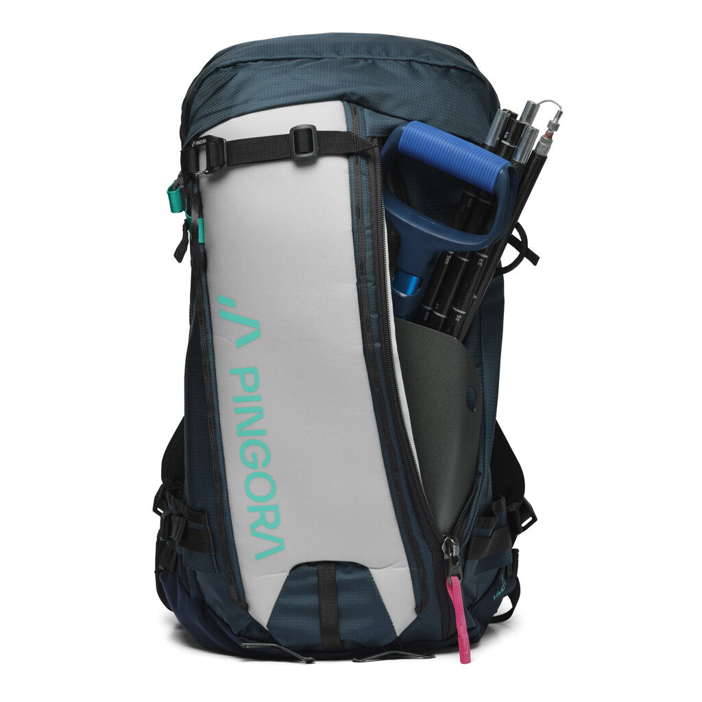 The ultimate in backcountry performance, the Pingora Vivid 27 Backcountry backpack will take you from resort laps to dawn patrol missions, and everything in between. Designed with the backcountry skier in mind, this pack has a dedicated avalanche gear pocket to keep your probe and shovel handy, plus EYL luggage zippers for added durability and abrasion resistance where you need it most. With a lined goggle pocket, A-frame and diagonal carry strap options, padded shoulder and waist straps, a helmet carry net, and an exterior made from 100% overrun fabric, this pack has everything you need to have the best day on the slopes. Rule the backcountry and rip up the resort with the perfectly sized Pingora Vivid 27L Backcountry Ski Pack from a company based right here in Salt Lake City!