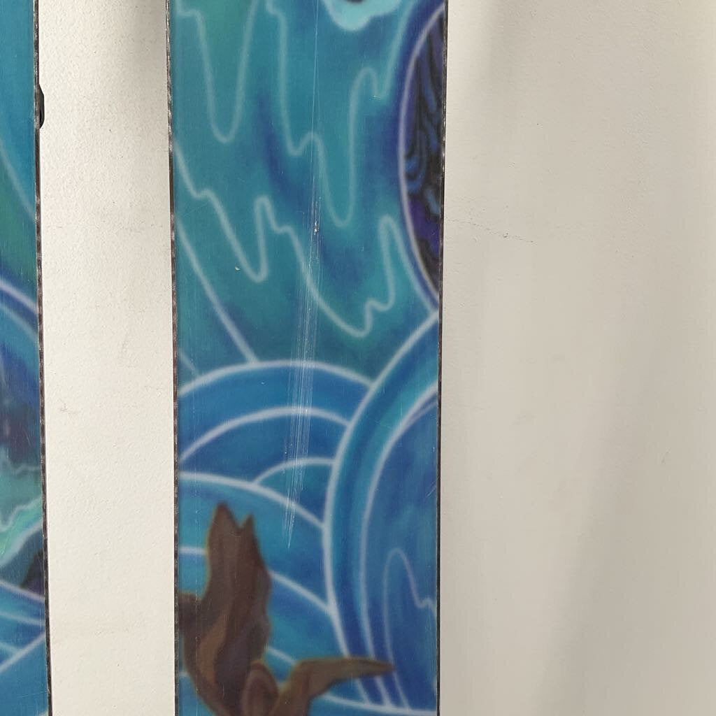 Well Loved - A well loved topsheet shows significant signs of wear and tear including chipping, scratching, and scuffing on a majority of the ski’s surface area.