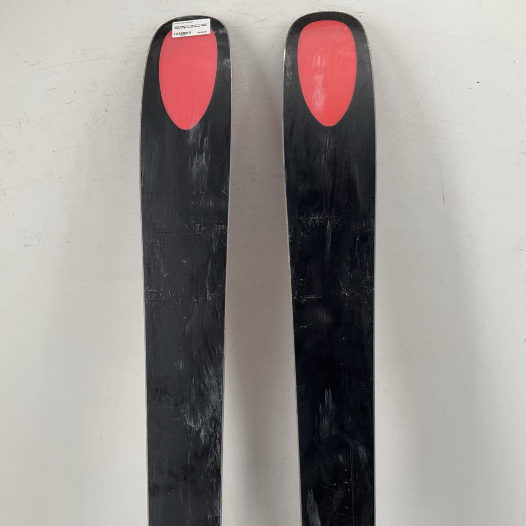 Well Loved - A well loved topsheet shows significant signs of wear and tear including chipping, scratching, and scuffing on a majority of the ski’s surface area.