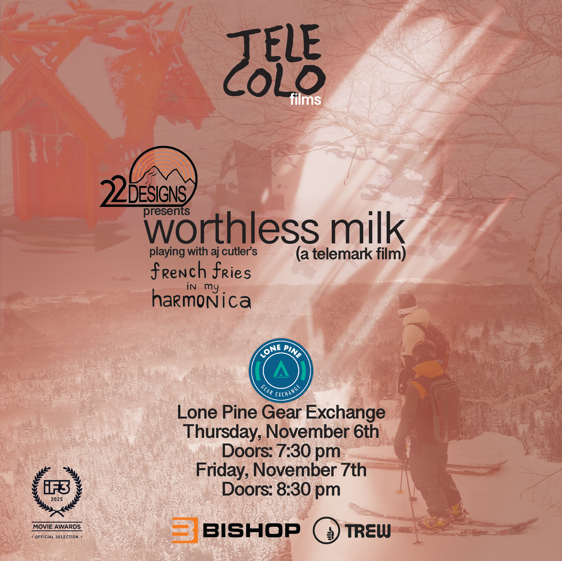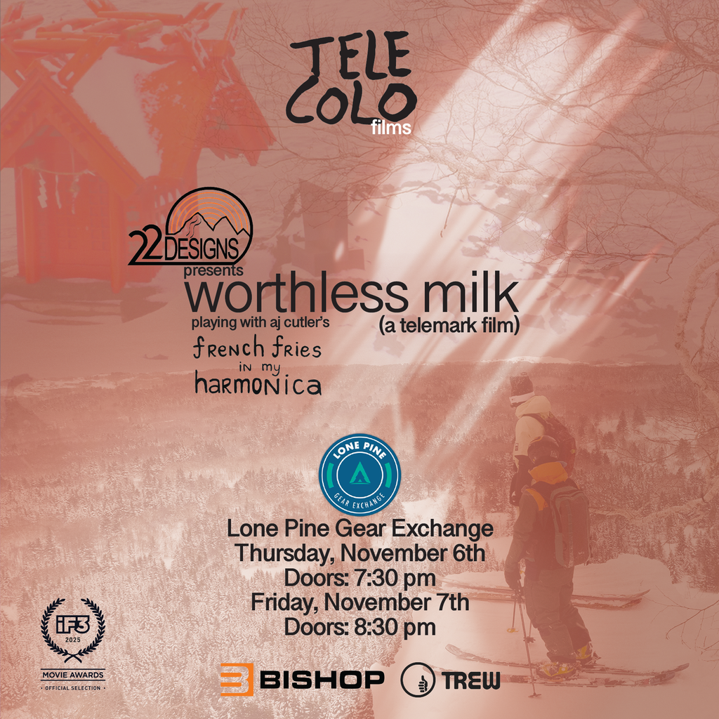 Join TELE COLO for the premiere of their third full-length telemark movie, "worthless milk", at Lone Pine Gear Exchange in SLC, UT on Thursday November 6 and Friday November 7, 2025!